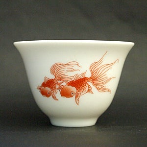 こちらは、台湾の高級茶器メーカー「風清堂」の金魚の茶杯です。白地に金魚が生き生きと泳ぐ様子がデザインされた個性的な茶杯です。