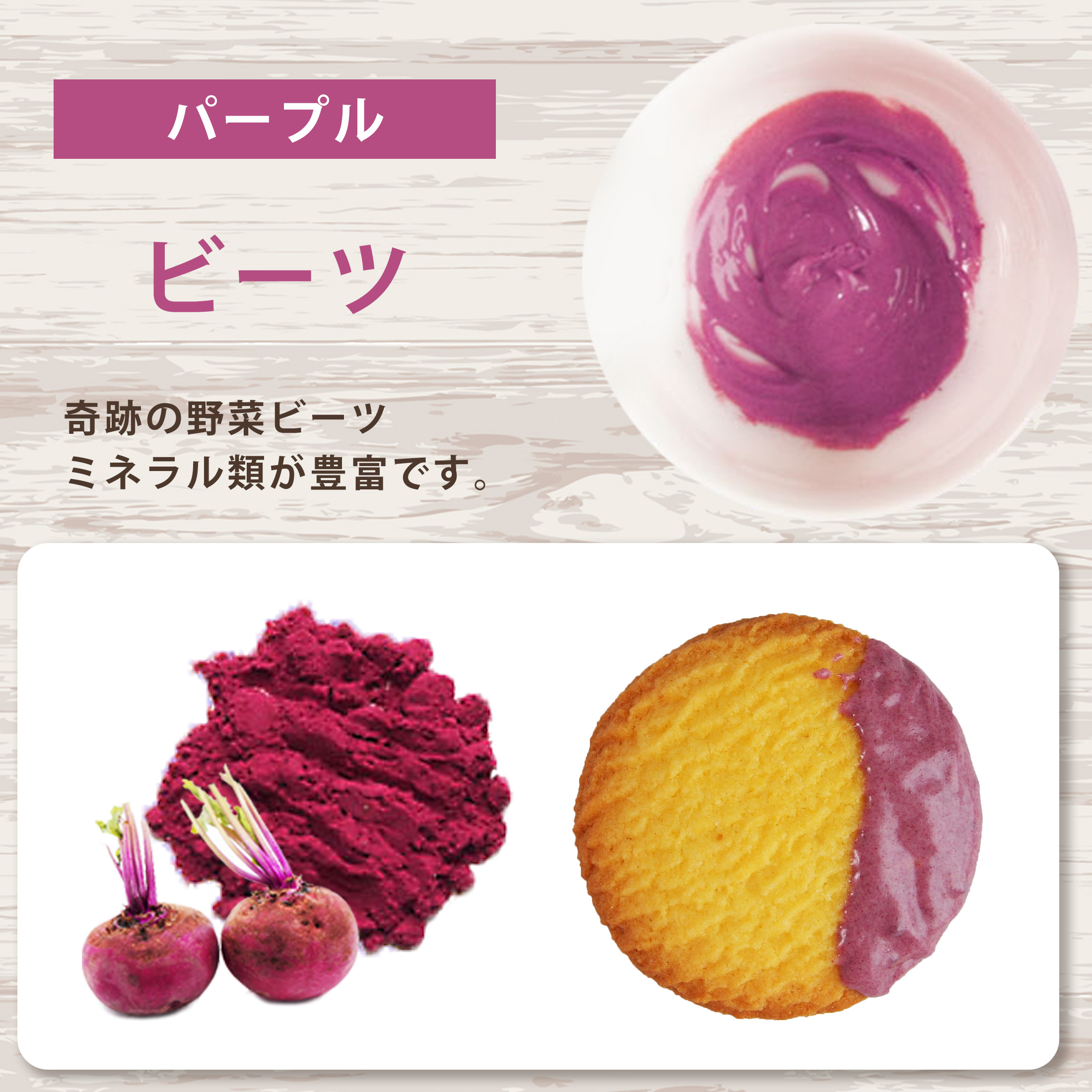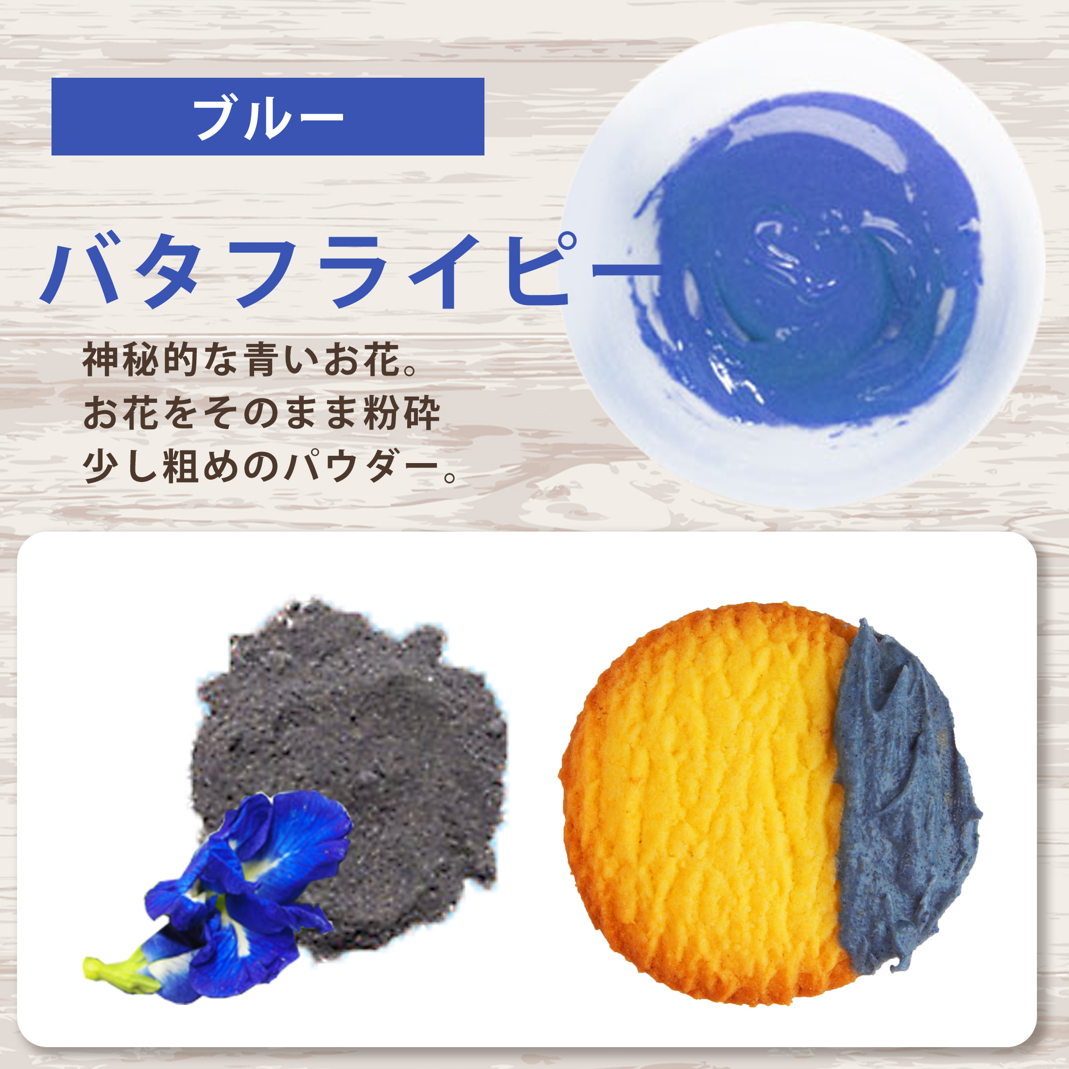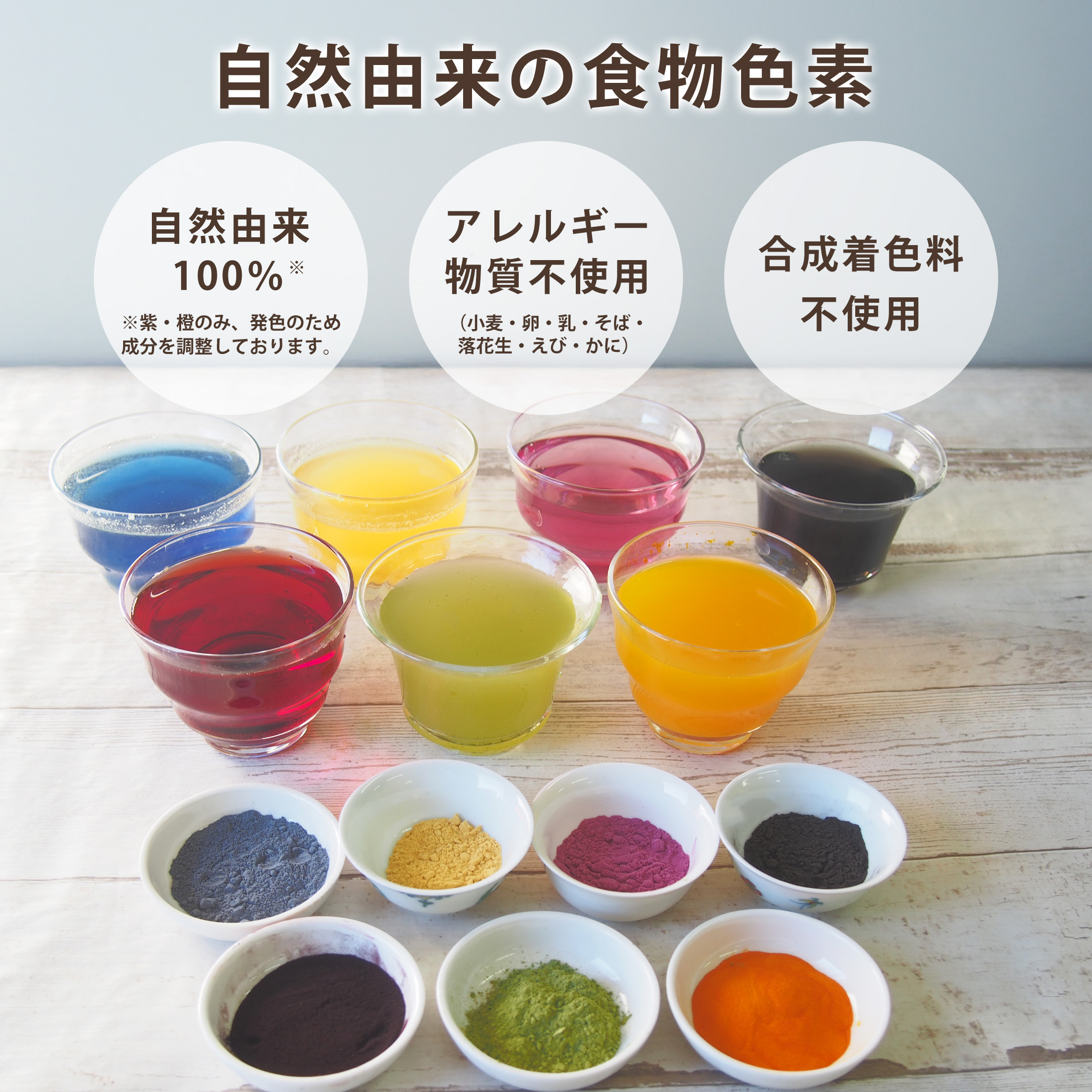 原材料: (赤)紅麹米 (紫)ビーツエキス、マルチデキストリン (橙)人参エキス、/加工デンプン、アラビアガム、ビタミンE、ビタミンC、微粒二酸化ケイ素、植物油、マルチデキストリン (青)バタフライピー (黄)かぼちゃ (緑)抹茶 (黒)黒豆皮、マルチデキストリン ※原材料につきまして アレルギー物質 (小麦・卵・乳・そば・落花生・えび・かに) を含む原材料を使用しておりません。最終加工地:日本  原産国:緑(日本)、青(タイ)赤、紫、橙、黄、黒(中国)内容量:7色×各10g