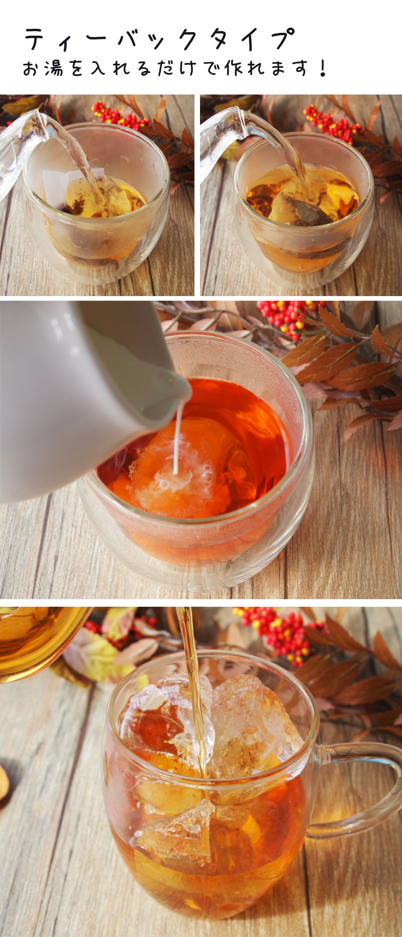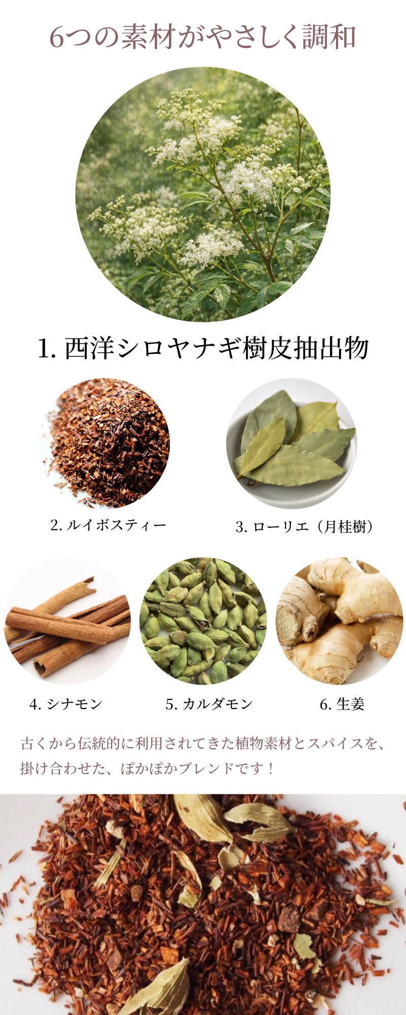 原材料ルイボスティー(南アフリカ産)、シナモン、カルダモン、ローリエ、生姜、西洋シロヤナギ樹皮抽出物